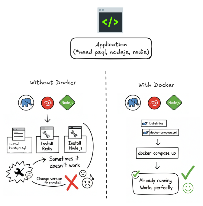 Without Docker, you often face environment issues like when we move it to other computer, friends, or server. you have to install nodejs, mysql, redis, postgresql, nginx, etc. and sometimes it also doesn't work because the version of the application is different.